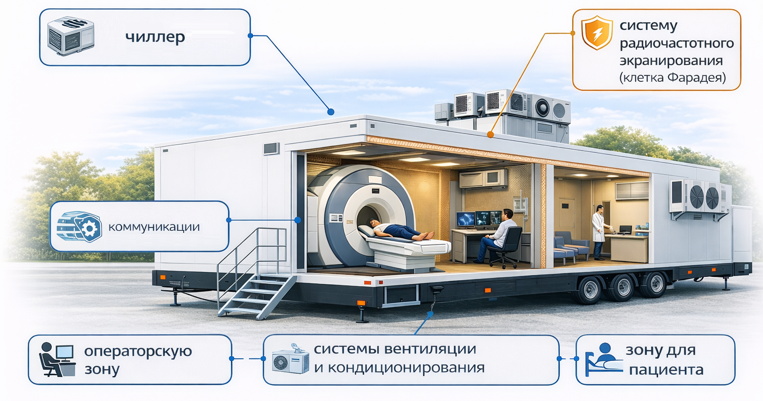 Мобильные здания для МРТ представляют собой современные модульные решения, позволяющие разместить магнитно-резонансный томограф без капитального строительства. Такой формат используется для быстрого запуска диагностического кабинета и подходит для медицинских центров, частных клиник и выездных решений.